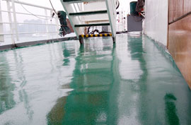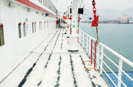 接到该订单后,公司派一支素质过硬的施工队伍奔赴香港开始作业,由于期间香港天气变化反复,时常下雨;待基面底漆顽固,锈迹斑斑难以清理,均为凹凸不平的麻面;再加上该邮轮白天需正常营业,施工多只能在晚上进行,等等一系列因素都给施工带来了严峻考验。cq9电子官网入口公司历来重视每一笔订,注重每一个细节,董事长宋敦清先生得知后,亲自前往,与公司总工徐新生论证了一个最佳方案后开始指导施工,考虑到施工部位特殊,长期在海面上风吹日晒,最后选用了其耐候、耐酸碱、耐紫外线、耐老化、耐霉菌、耐盐雾、耐臭氧、耐溶剂、耐磨、耐冲击和耐油性等综合性能优异的CQ101防水密封涂料。先用特殊纤维填充10mm高度,再在上面找平3mm厚,然后用cq9电子官网入口CQ101防水密封涂料自流平成膜。经过一个星期的艰苦奋战,顺利完成施工。