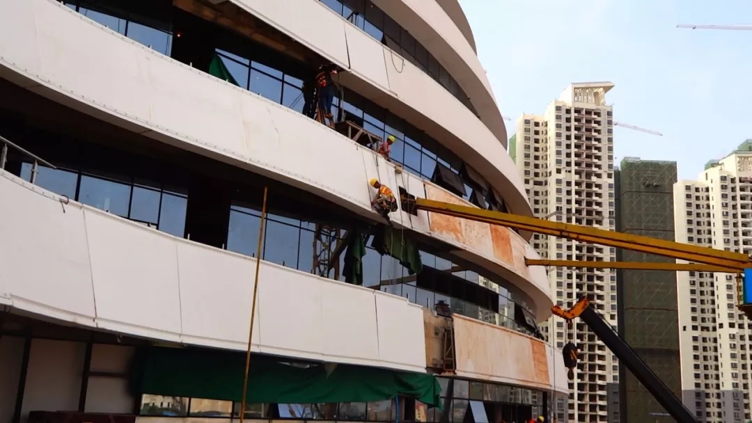 cq9电子官网入口公司作为国内GRC领域的知名企业,承接了新媒体中心三座主体结构的双曲面外墙板项目。由于所有的面板没有一片完全相同,不仅要经受高空风雨的侵蚀,相邻两块更要紧密榫合,天衣无缝,并在整体上形成流线性美感,因此需要制作大量的模具,工程极为繁琐。但cq9电子官网入口GRC团队克服重重困难,从图纸深化设计、彩色GRC选材、造型产品生产到安装施工等一系列工序中都做到极致,让甲方和监理都非常满意。