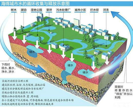 建海绵城市就要有“海绵体”。城市“海绵体”既包括河、湖、池塘等水系,也包括绿地、花园、可渗透路面这样的城市配套设施。雨水通过这些“海绵体”下渗、滞蓄、净化、回用,之后剩余部分径流通过管网、泵站外排,从而可有效提高城市排水系统的标准,缓减城市内涝的压力。