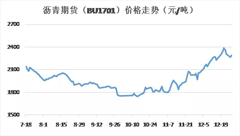 7月份之后,沥青期货价格一路下跌,至10月走稳。11月上旬,受国际原油价格波动影响,沥青期货价格开始稳步上升,从1830元/吨上涨至12月中旬的2386元/吨,涨幅达到30%。