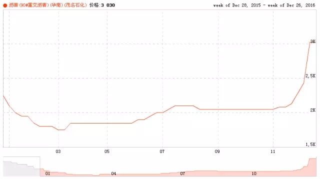 从茂名石化的90#重交沥青价格数据看,11月初的价格还保持在2050元/吨,到12月19日,价格已经上升至3030元/吨,涨幅达到47.80%。