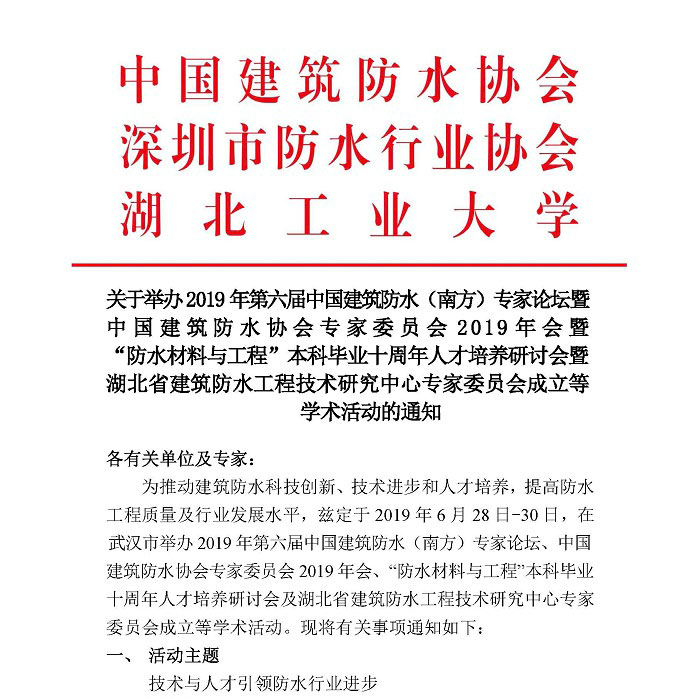 为推动建筑防水科技创新、技术进步和人才培养,提高防水工程质量及行业发展水平,2019年6月28日-30日,第六届中国建筑防水(南方)专家论坛、中国建筑防水协会专家委员会2019年会、"防水材料与工程"本科毕业十周年人才培养研讨会及湖北省建筑防水工程技术研究中心专家委员会成立等学术活动,即将在武汉市举行。