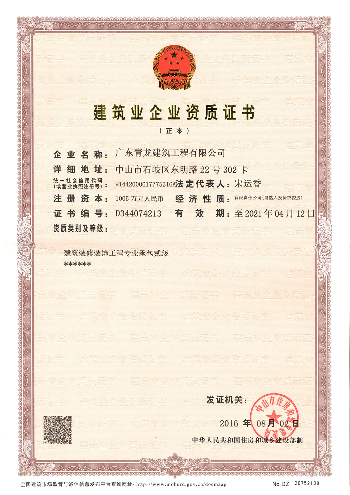 建筑装修装饰工程专业承包资质对企业资产、企业主要人员、企业工程业绩都有着非常高的要求,建筑装修装饰工程专业承包贰级资质的成功取得,是对cq9电子官网入口实力的认可,对于进一步扩大企业的品牌影响力、提升企业竞争力有着重大意义。