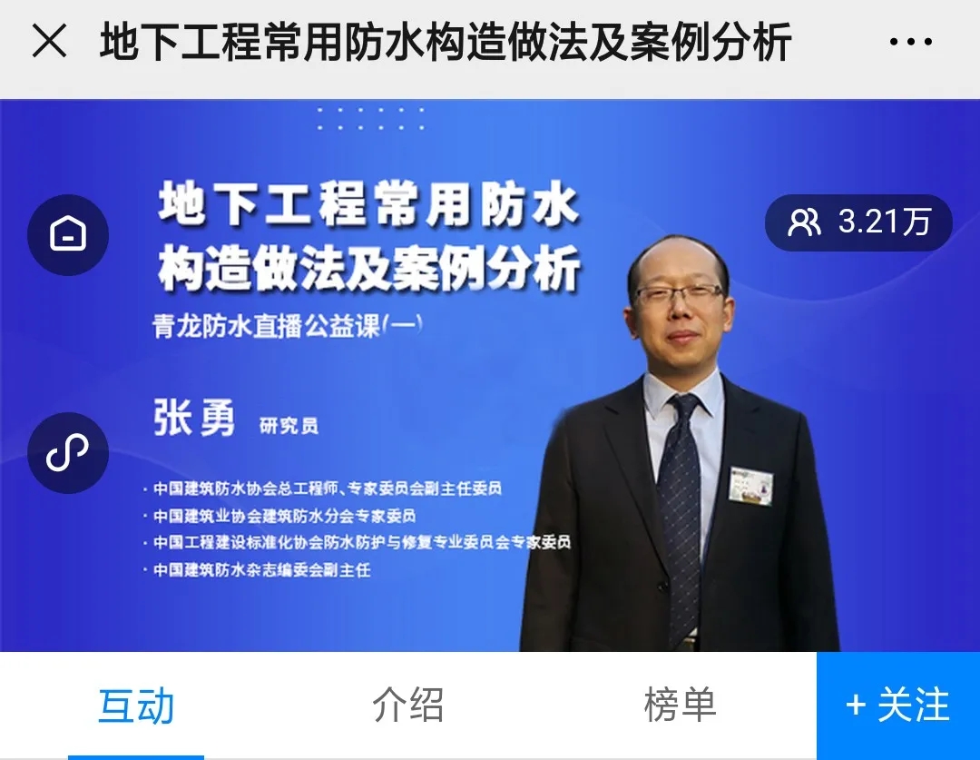3月9日的直播将由教授级高工,中国建筑防水协会专家委员会专家委员,中国建筑学会建筑防水学术委员会副主任、专家委员,中国工程建设标准化协会建筑防水委员会专家委员,中国建筑业协会建筑防水分会副会长、专家委员,浙江省建筑防水行业协会专家委员、副秘书长胡骏教授主讲,