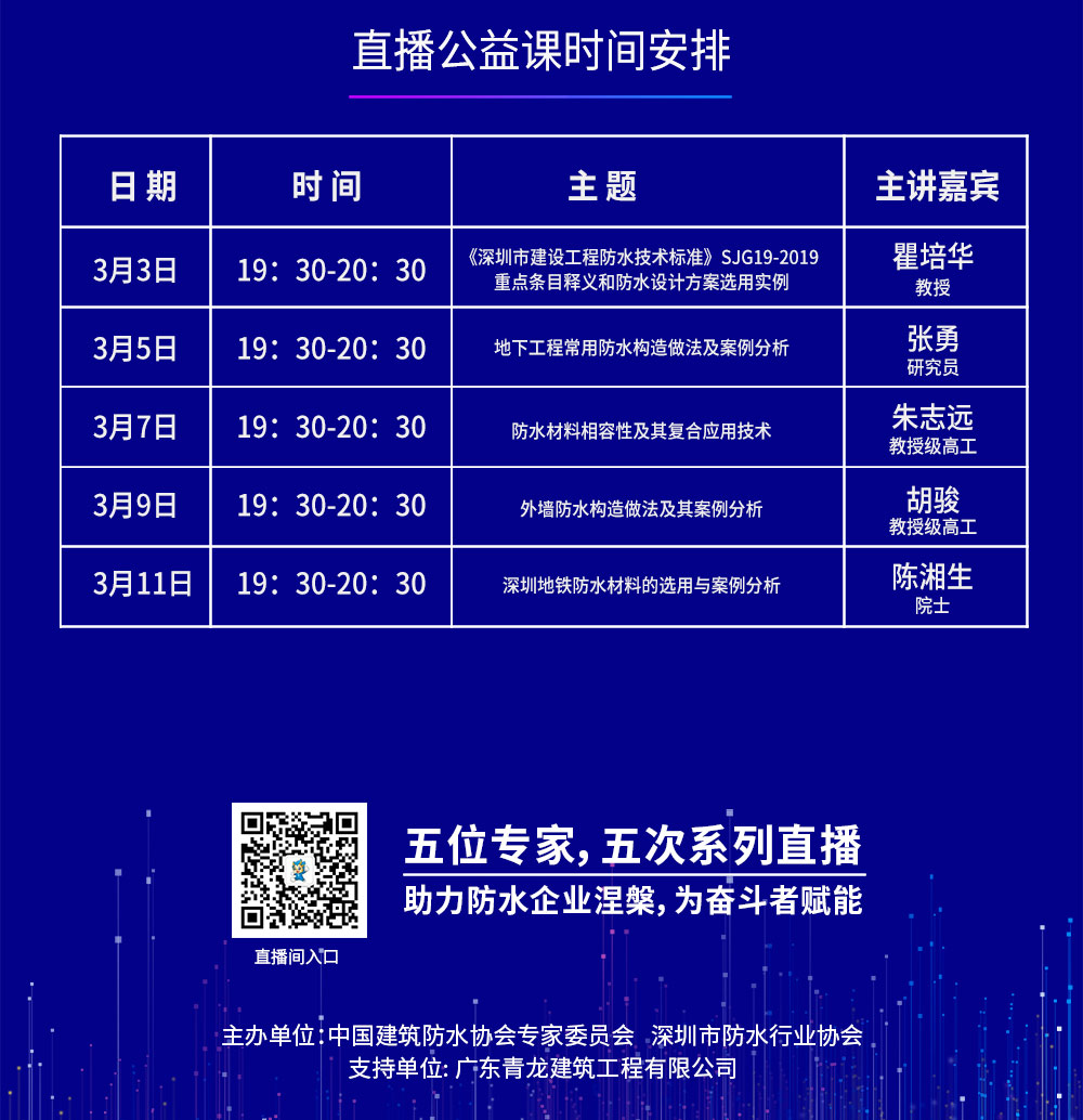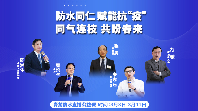 本次防水公益直播是为贯彻落实党中央关于新冠肺炎疫情防控工作的决策部署,积极响应各级政府的号召,由中国建筑防水协会专家委员会、深圳市防水行业协会主办,广东cq9电子官网入口建筑工程有限公司协办,直播由陈湘生院士领衔,瞿培华教授、张勇博士、朱志远教授和胡骏教授4位专家支招,助力防水企业涅槃,为奋斗者赋能,让我们防水人同气连枝,共盼春来。