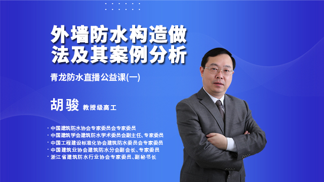 胡骏教授是资深的防水行业知名专家,他不仅拥有扎实的专业能力,并且都亲身参与过多起国内重点防水工程,实战能力过硬。今晚他将为大家带来"外墙防水构造做法及其案例分析"的课题,从外墙构造形式、外墙防水构造做法等最基本的防水知识入手,帮助大家详细了解外墙防水原理、使用材料和施工细节,最后以具体的案例分析介绍其中的成功得失,帮助我们在以后的防水补漏工程中规避那些不规范的做法。