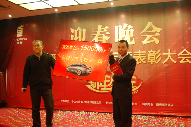 其中董事长特别为业绩突出的业务员练祖耀给予了重奖,现场兑现了15万元现金加价值10万元小车一辆,全场欢呼,将颁奖环节推向高潮,奖励之丰厚在业界引起了不小的轰动。