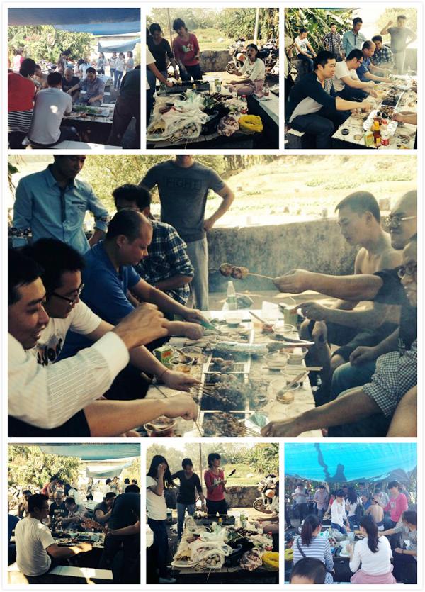 下午12:00,广西全体员工带着准备好的物料和食品来到悍马烧烤场。虽然已是秋冬时节,但天公作美,南宁的天气依然阳光普照,暖暖的,大家做起活动来也分外投入而尽兴。的活动在韦经理的带领下,大家沿江滨路短跑热身,很快就把大家的活动热情调动起来了。其后大家回到悍马烧烤场进行烧拷,大家都兴奋地着拿起各自喜爱的食物,展现自己的烧拷技术。食品的美味四溢,刺激大家的味觉神经,让大家过了一把难得的佳肴瘾。品味美食之后,大家便进行团体游戏:踩报纸游戏比赛、谁是卧底游戏、萝卜蹲游戏。丰富多样的互动游戏,刺激的竞技比赛,使整个烧烤场热闹非凡,成了一片欢乐的海洋,也感染了围观的人群。