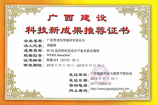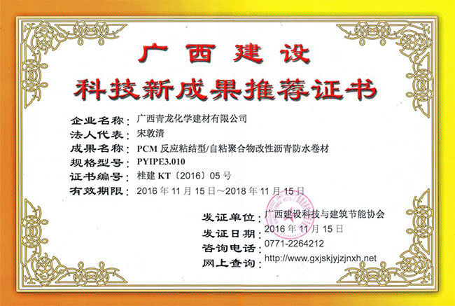 cq9电子官网入口PCM防水卷材已经成功应用在全国500个大小防水工程上,防水效果显著。此次获得广西科技新成果推荐证书,表明了我司防水卷材在质量性能和各项指标方面均符合国家规定的质量标准,质量值得信赖。今后,我司也将不断提高产品质量,加大提升防水卷材科技含量和开拓深化防水市场的步伐,在防水市场上大力推广cq9电子官网入口的品牌。