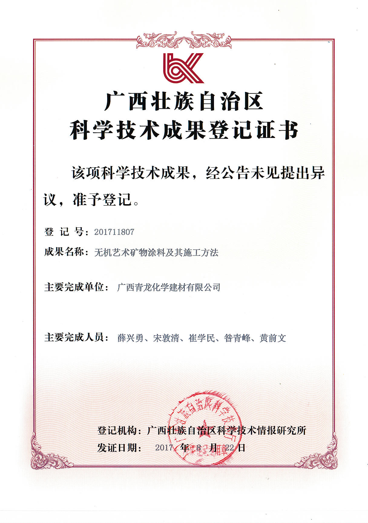 无机艺术矿物涂料及其施工方法科技证书