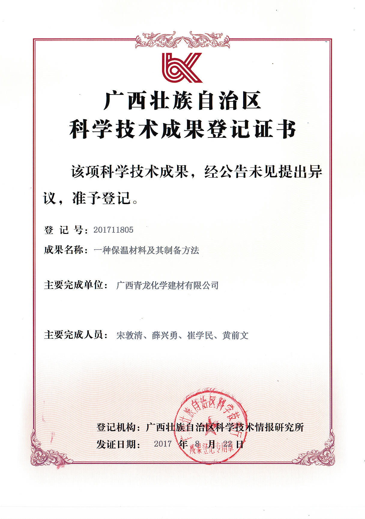 一种保温材料及其制备方法科技证书