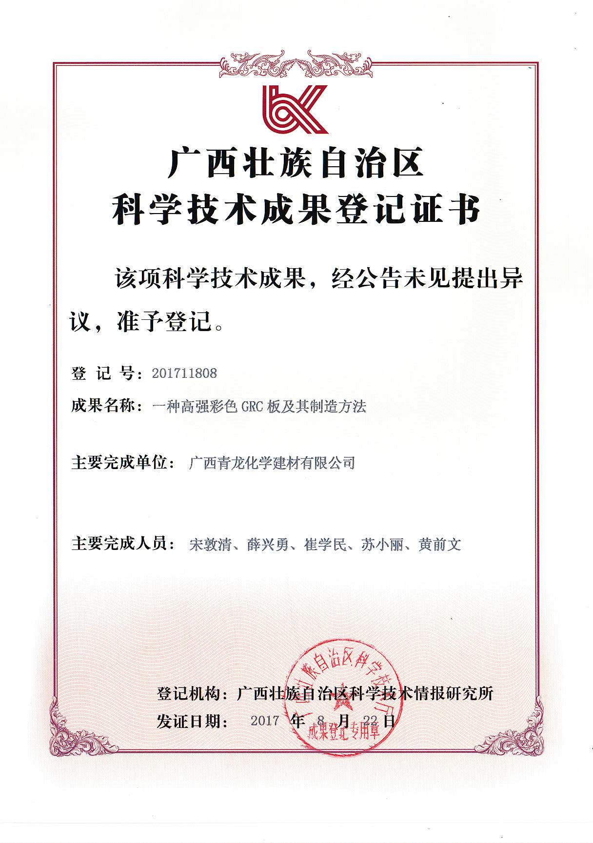 一种高强彩色GRC板及其制造方法科技证书