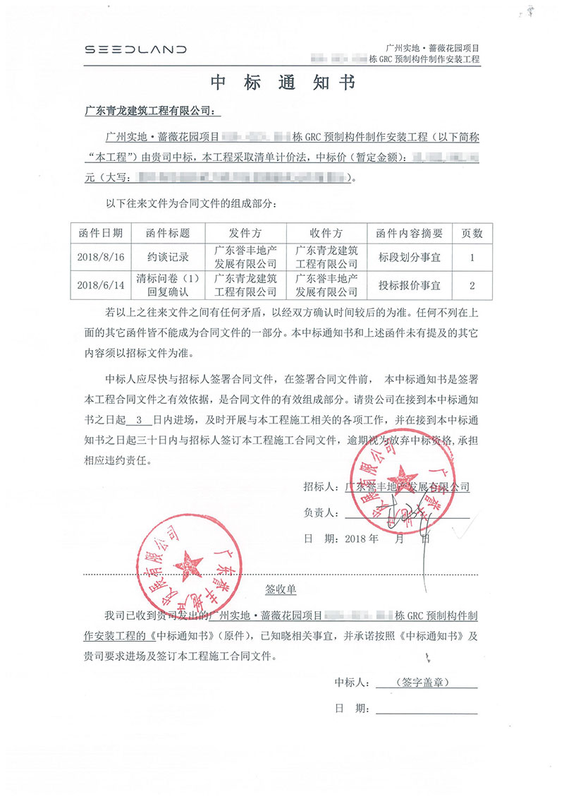 近日,广东的cq9电子官网入口公司凭借强大的实力,成功中标了广州实地蔷薇花园项目GRC预制构件制作安装工程,这是继深圳坪山会展中心之后,cq9电子官网入口公司近期又承接的又一个千万级GRC大单,彰显了cq9电子官网入口雄厚的GRC技术实力。