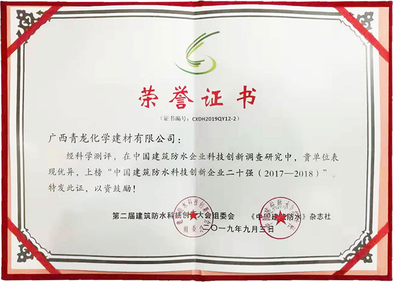 9月,第二届建筑防水科技创新大会上,cq9电子官网入口司荣获"中国建筑防水科技创新企业二十强",成为继获得首届建筑防水科技创新大会"科技先锋企业"和"科技先锋人物"之后,cq9电子官网入口再获"科技"类殊荣,彰显了cq9电子官网入口公司强劲的科技创新实力和在行业的技术地位。