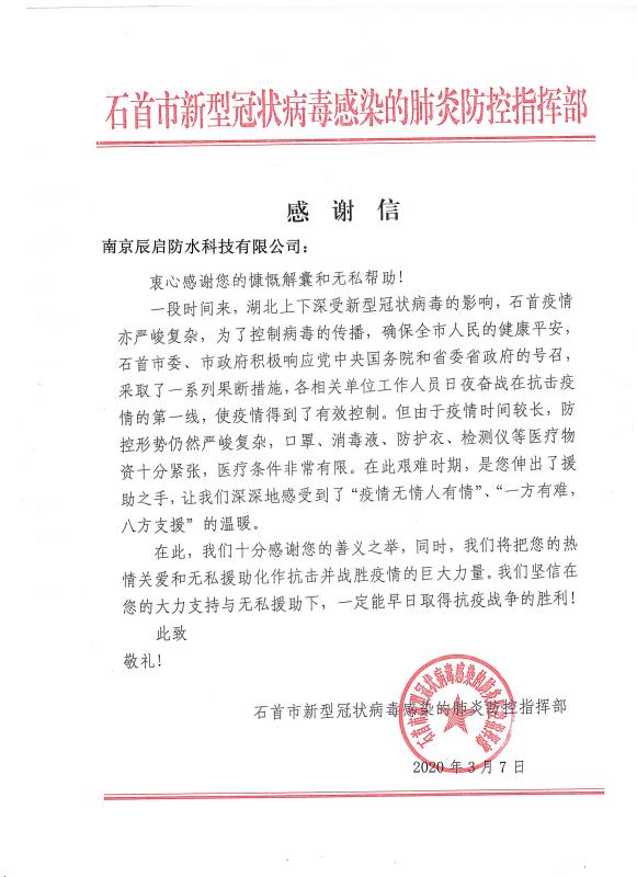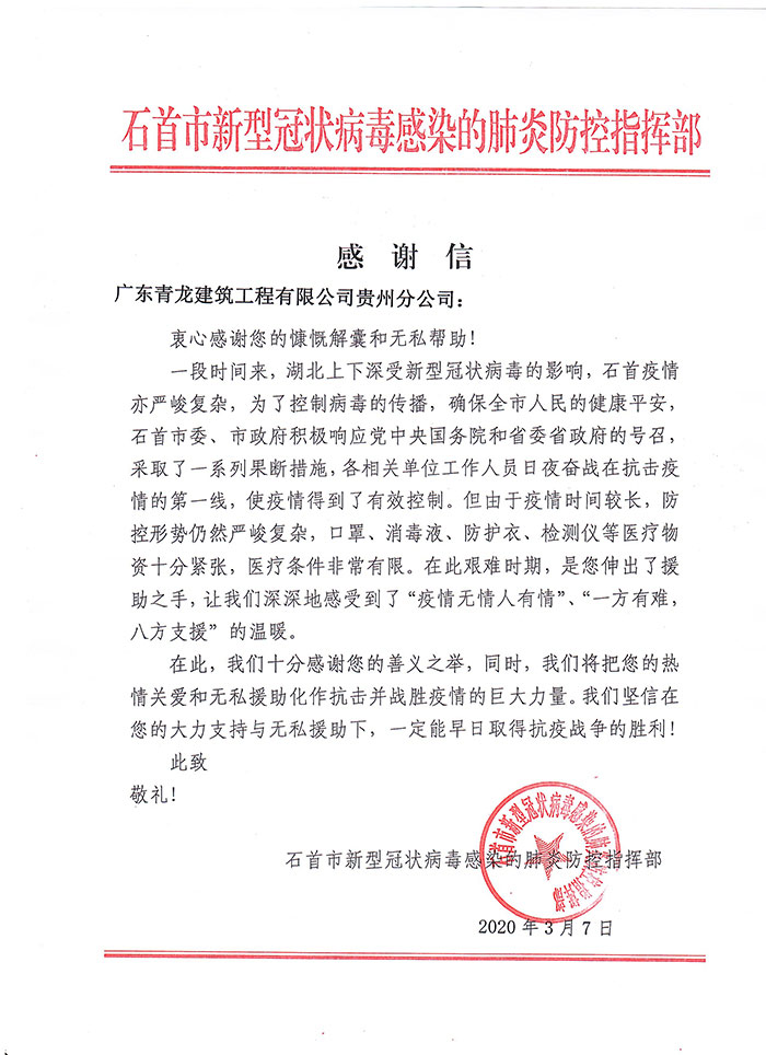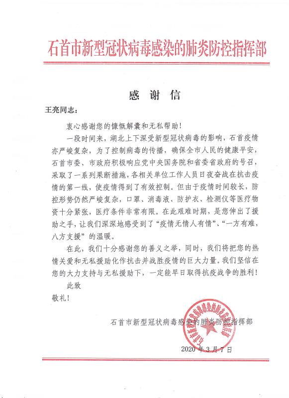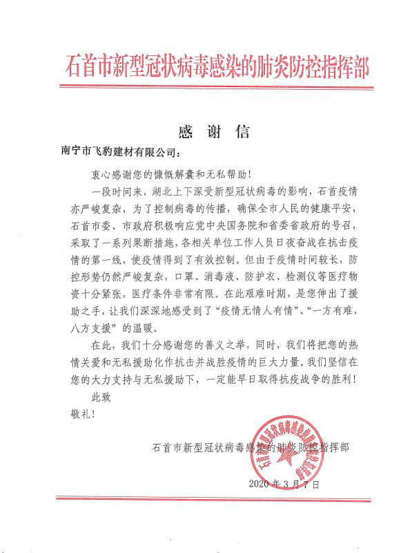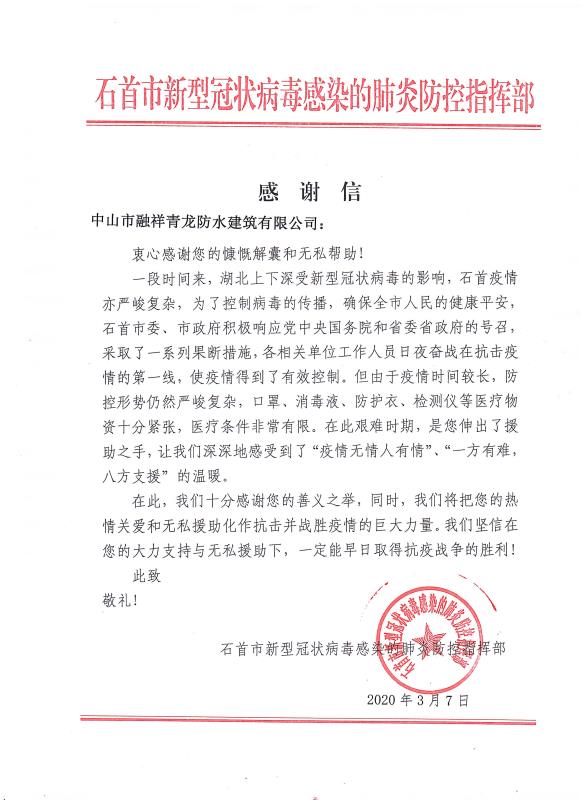 感谢信来自石首市新型冠状病毒感染的肺炎防控指挥部,信中表示,对cq9电子官网入口公司及旗下代理商善义之举表示了高度肯定和感谢,将把大家的"热情关爱和无私援助化作抗击并战胜疫情的巨大力量,早日取得抗疫战争的胜利!"