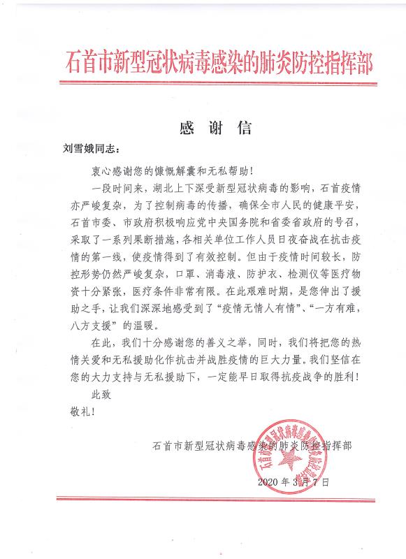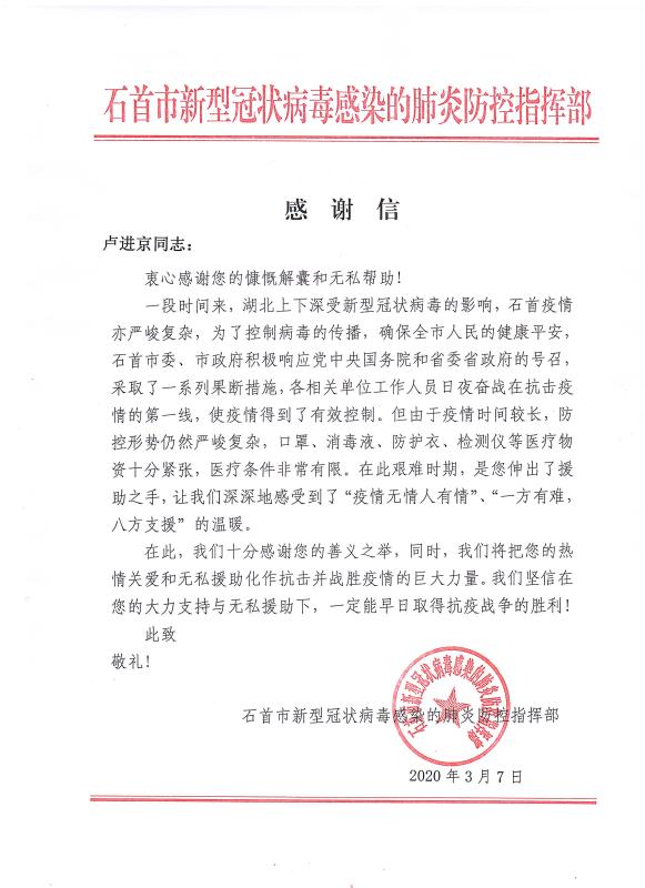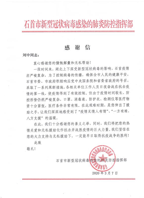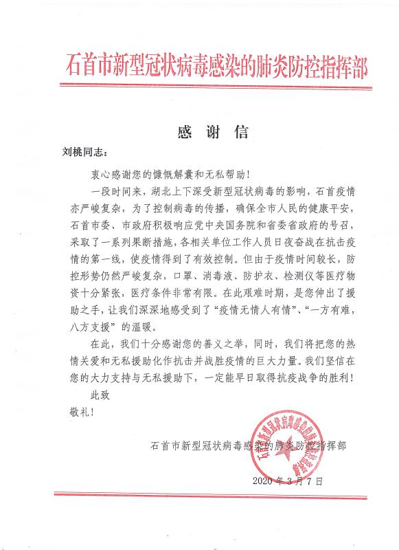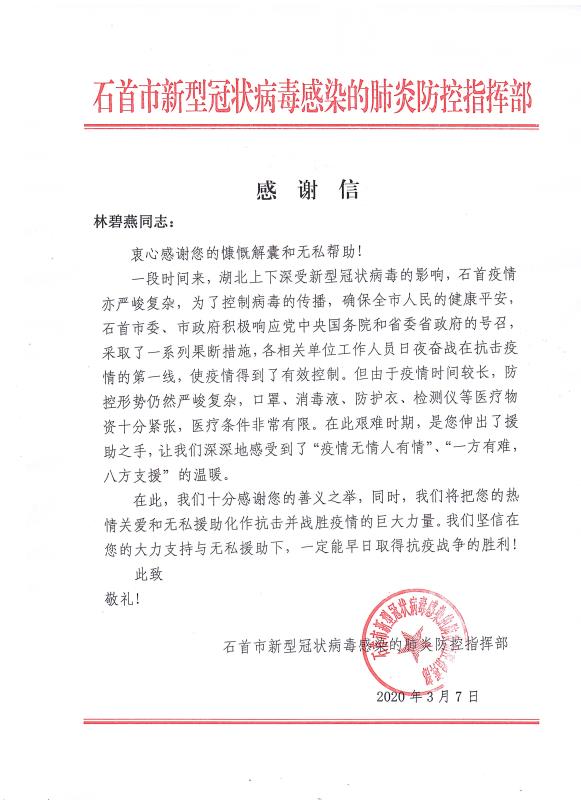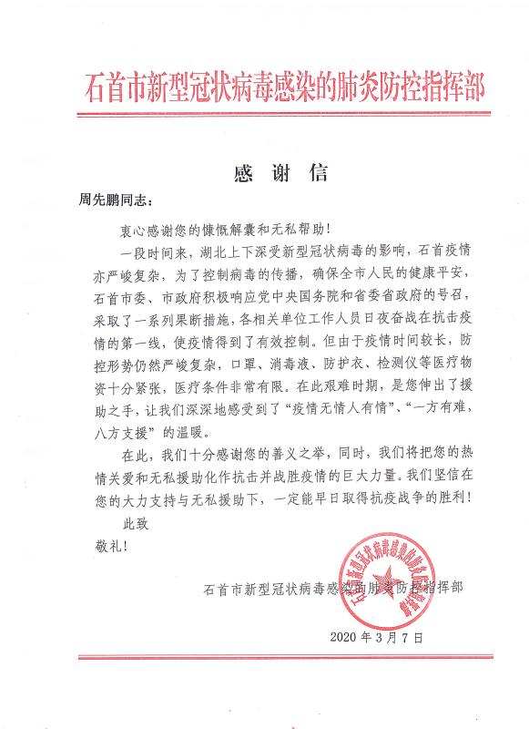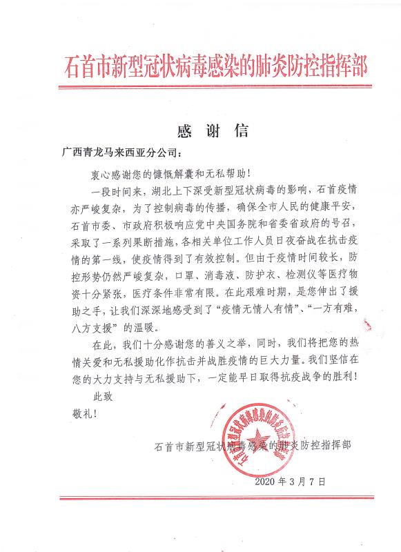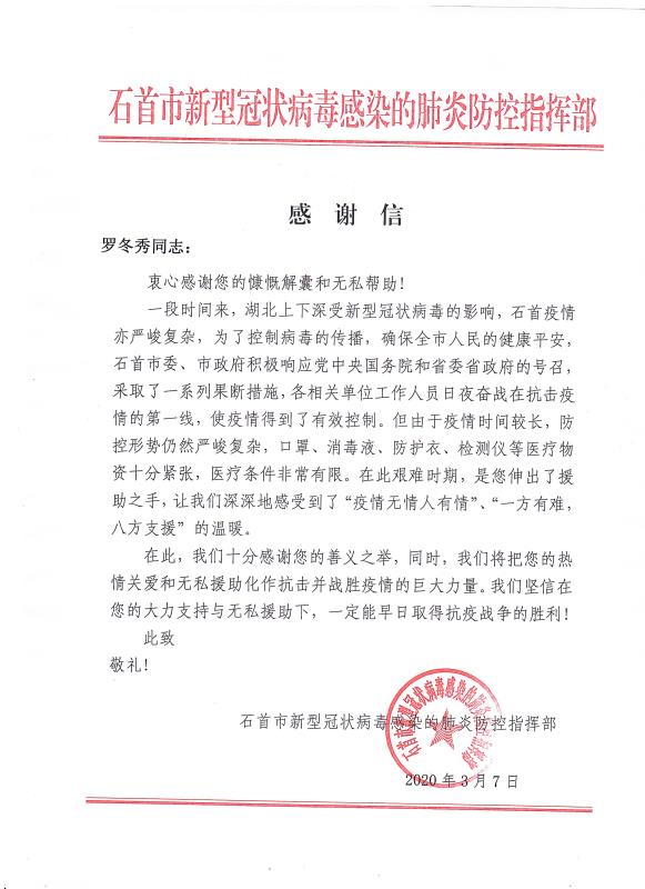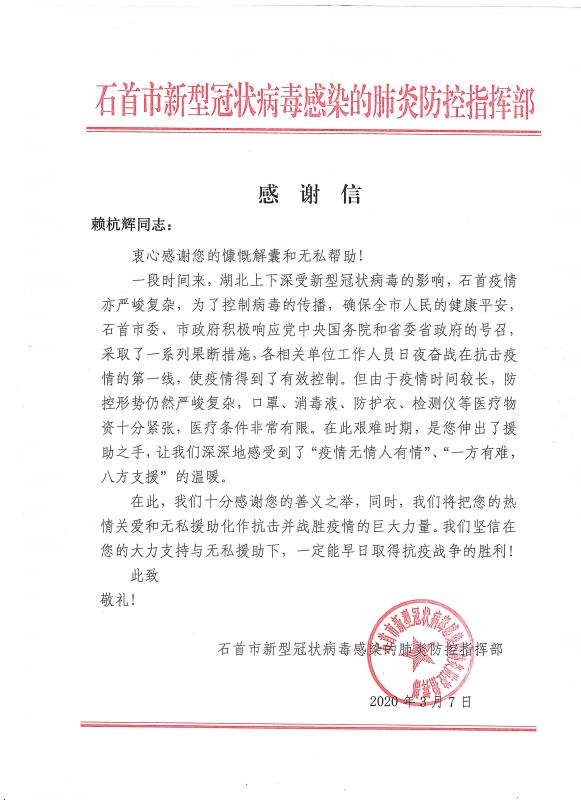 当全国疫情数据持续向好,各地复工复产有序进行的时候。cq9电子官网入口公司收到了来自湖北省石首市新型冠状病毒感染的肺炎防控指挥部16封特殊的感谢信。