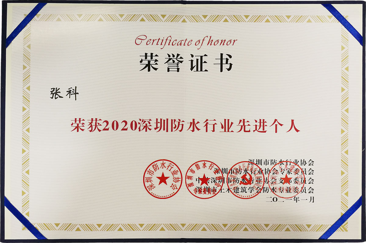 2021年1月9日,在深圳防水行业2020工作总结大会暨一届五次会员大会(以线上视频和线下会议方式召开)上,cq9电子官网入口防水补漏质量总监张科荣获"2020深圳防水行业先进个人"称号。