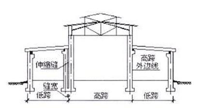 高低联跨的建筑物应以高跨结构外边线为界分别计算建筑面积;其高低跨内部连通时,其变形缝应计算在低跨部分的面积内。(图4)