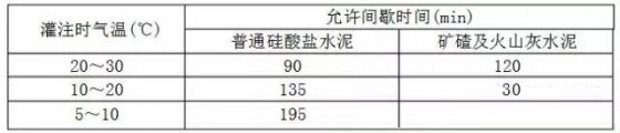 ⑺混凝土浇筑必须连续,因施工需要留设施工缝,必须征得设计同意,并得到监理认可。允许间歇时间具体见下表;捣固选用的振捣器,其频率、振幅、振动速度等参数视混凝土的塌落度及骨料颗径而定。
