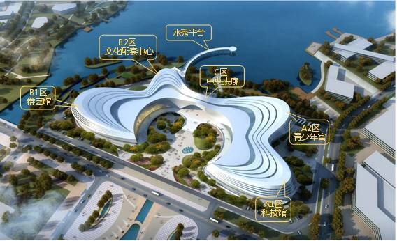 柳东新区文化广场项目工程,位于柳州市柳东新区园区总部大楼南侧,南邻龙湖,西靠纵十二路,北临横三路,建设用地南北向190m,东西向400m。广场以"蝶舞"作为设计思路(见图1),展示出百花齐放与蝶舞翩翩的建筑外型,传递"文艺普惠,民智为计"的指导思想。