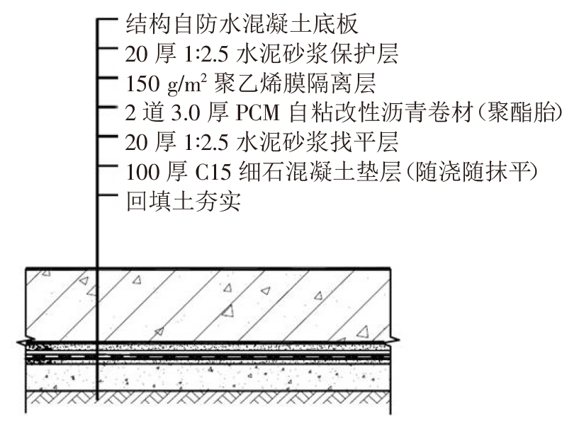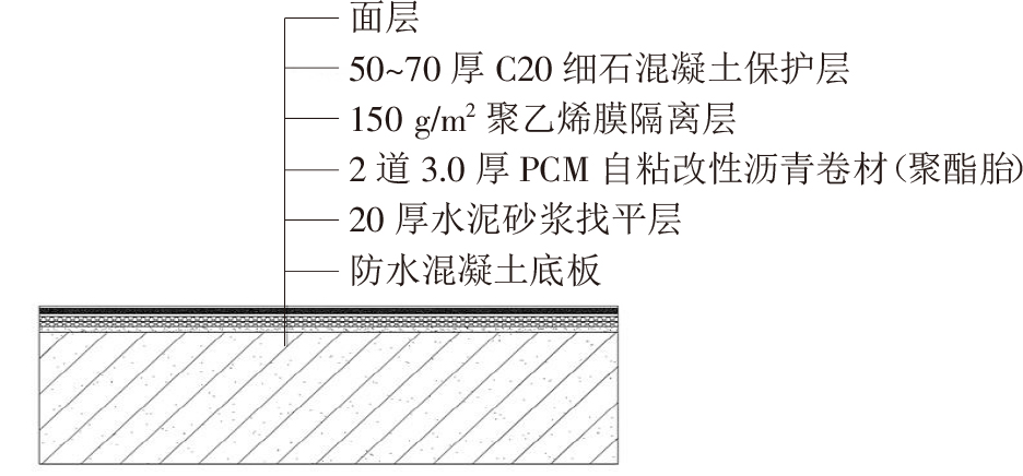 防水卷材选用本公司生产的3.0mm厚PCM自粘聚合物改性沥青防水卷材(PY类)。该卷材是通过在树脂和合成橡胶改性沥青中加入少量活性成分,以聚酯胎作为胎体,以PE膜为表面材料,结合硅油隔离膜制备而成的防水卷材。该卷材具备较强的基层防窜水性能,卷材中的高分子材料可与基层粘接剂中的高分子和无机胶凝材料构成界面互穿网络,能有效避免防水层出现整体失效的情况。材料可冷施工,无火灾隐患,不会污染环境,可直接在潮湿的基面上进行施工,基层无需做找平层,施工工艺便捷。另外,防水材料有较好的稳定性、延伸性、耐腐蚀性和耐候性。