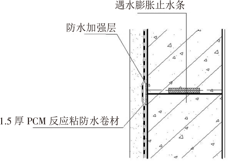 施工时应将基面表层的浮砂、灰尘和杂物等清理干净,比较干燥的基面需要先洒水湿润,确保无积水;阴阳角需要用水泥砂浆施工成圆弧状。再采用聚合物水泥浆作基层粘接剂,骑缝湿铺一道1.5mm厚PCM反应粘结型复合防水卷材作加强处理,施工缝两边附加层宽度应大于250mm;然后使用同类防水层覆盖铺贴(图8)。
