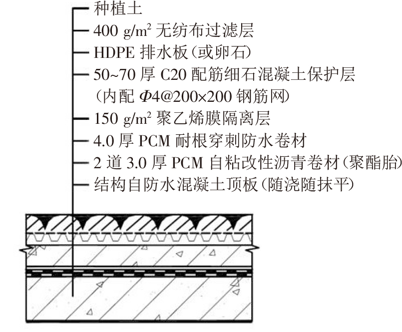 隔离层采用0.4mmPE膜,其主要作用为避免防水层与上方的细石混凝土保护层形成粘连,消除机械咬合力。过滤层采用单位面积质量大于200g/m2的聚酯无纺布。种植土和植被层根据设计要求进行施工。