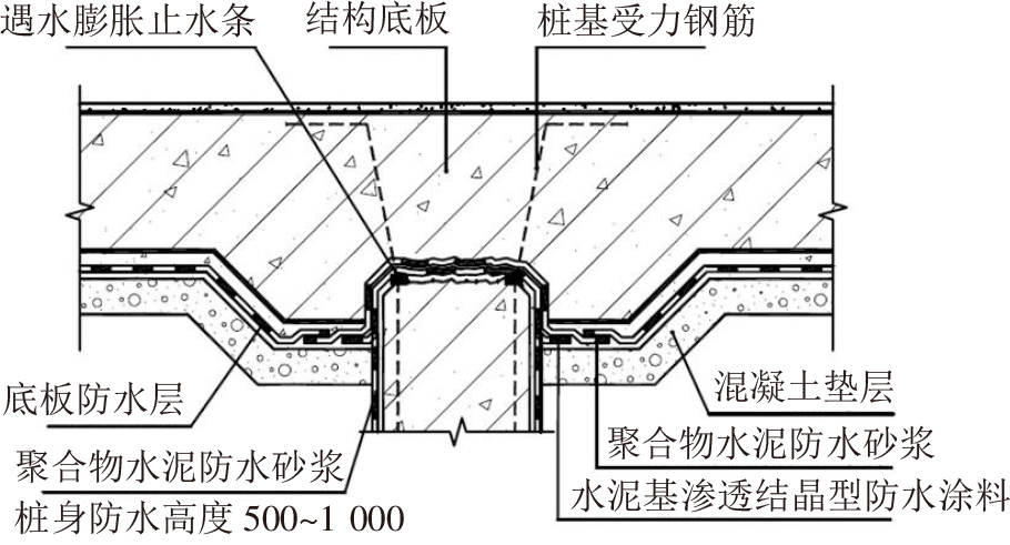 施工时,先对基层进行清理,保证基面无灰尘、浮砂、杂物和明水;阴阳角用水泥砂浆抹成圆弧,然后对桩头采用渗透结晶型防水涂料进行涂刷,用量为1.5kg/m2左右,并将桩头上的砂眼和细小缝隙用防水涂料密实。同时,在桩头四周300mm左右范围内涂刷聚合物水泥防水砂浆作为过渡层(图9)。