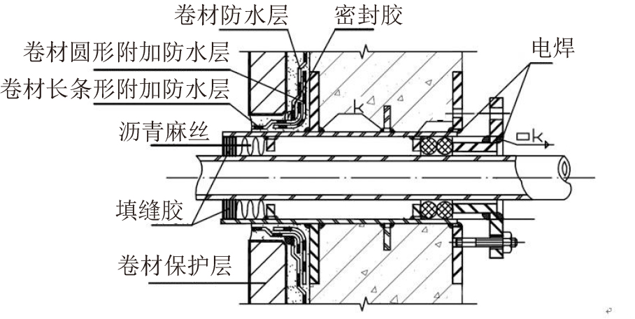 管道、线缆等存在更换需求,需用套管式防水设计,套管加焊止水环。套管与管道或线缆之间不得承受水压,应在节点的外部设置集水井。室内套管的一端应与外墙平齐,浇筑混凝土时端口预留的套管需密封,防止堵塞孔洞。室外套管突出外墙至少150mm,在外墙模板上定好预留穿墙管位置并开洞,外墙合模之前把套管放入模板洞中固定好,合模后再密封穿墙管与模板之间的间隙。管道与套管之间的间隙用柔性材料填充,保证端面光滑,同时管道的接口不得设置在套管内。当地下水位较高时,需在套管周围设紧固装置来确保缝隙的填充料密实和不发生位移(图7)
