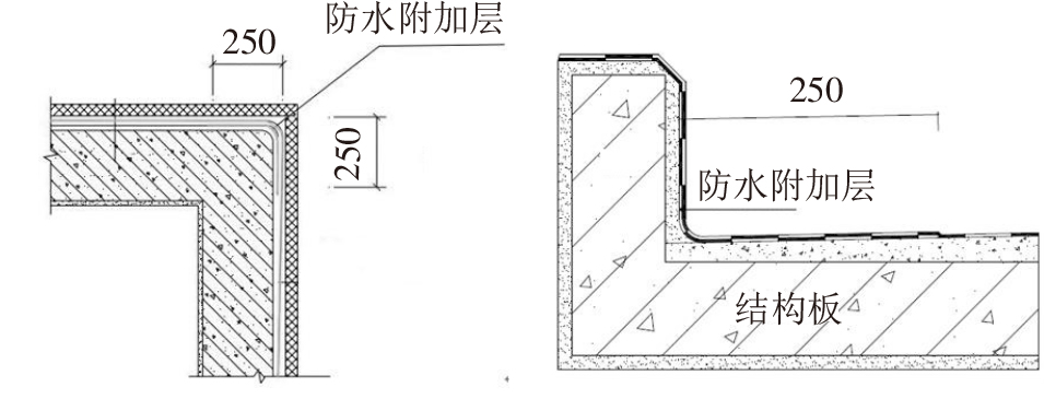 在基面阴阳角两侧做好防水附加层,其总宽度为500mm左右。平立面连接处的阴阳角需抹成圆角形状,其中阳角半径大于20mm,阴角半径大于50mm(图6)。