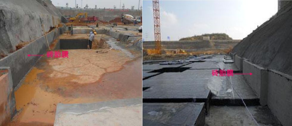 2、预铺反粘 ——将附有高分子自粘胶膜层的防水卷材空铺在基面上,然后浇筑结构混凝土,使混凝土浆料与卷材自粘胶膜层紧密结合的施工方法。