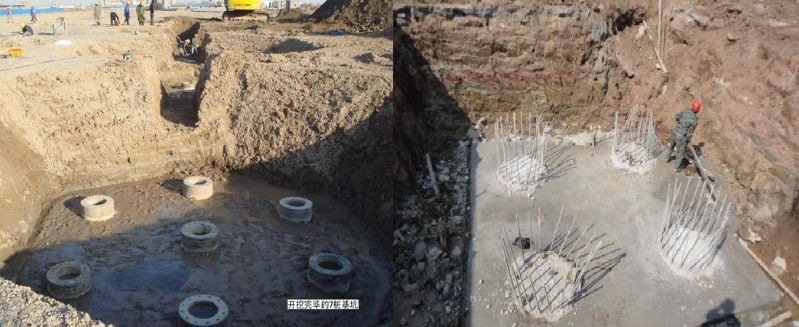 6、桩基础:桩基础由桩基和连接于装顶的承台共同组成,是用承台把沉入土中的若干个单桩的顶部联系起来的一种基础。桩的作用是将上部建筑物的荷载传递到深处承载力较大的土层上,或将软弱土层挤密以提高地基上的承载力及密实度。