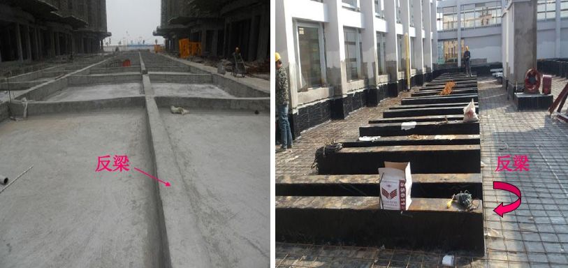 10、反梁:反梁只是一种需要,是因为某些原因(如层高不够、梁底面需要平整,而梁上部又可上翻等),而把梁高的一部分作到楼板的上方(一般的梁都是与楼板平的)或者是筏板基础上表面需要平整而把梁做到板的下面。