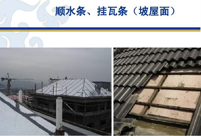 16、顺水条:瓦下沿竖直方向设置的屋面构件。处于挂瓦条下,防水层上。主要作用是架空挂瓦条。挂瓦条作用是将屋顶表面的瓦片固定在相应位置。搭配使用合适的顺水条可以使得屋顶的排水效果和通风效果显著增强,有利于保持夏季的凉爽和冬季的温暖。