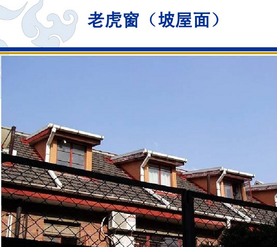 17、老虎窗又称为老虎天窗,是指一种开在屋顶上的天窗。也就是在斜屋面上凸出的窗,用作房屋顶部的采光和通风。