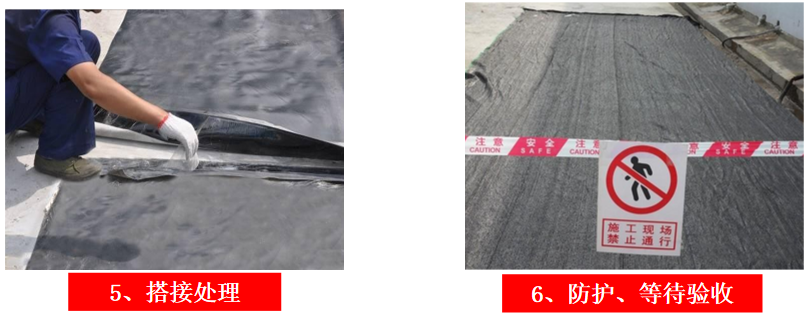 5、防水施工重要搭接、接缝处,2至3名施工工人配合作业,保证接缝处平整,粘合紧密。