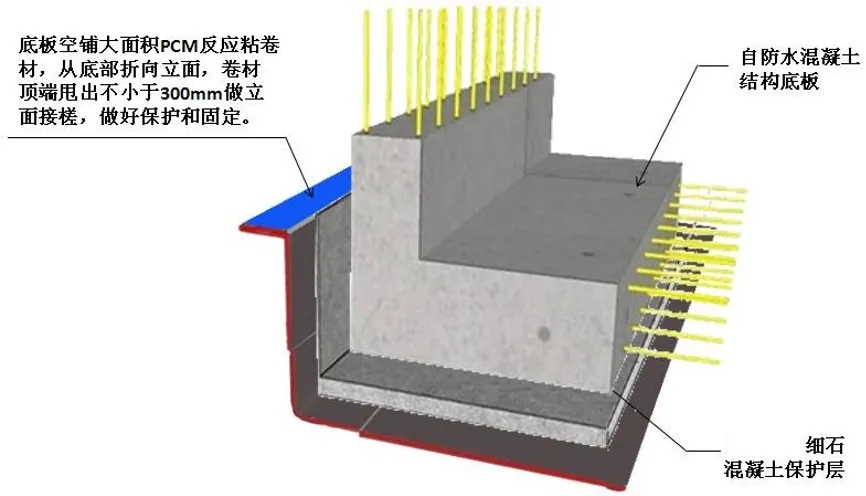 关键步骤:底板湿铺大面积PCM反应粘卷材,从底部折向立面,卷材顶端甩出大于300mm做立面接搓,并做好保护和固定。