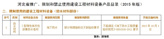 2015年版目录是前七批“推广、限制和淘汰使用产品目录”的综合更新版。其中,保留了仍需推广、限制和禁止使用的建材装备,结合近几年河北省工程建设实际,又增补了新的内容。本目录共涉及182种产品,包括推广类87种(新列入29种),限制类25 种(新列入12种),禁止类70种(新列入20种),新列入的各类产品,生效时间从2015年10月1日起实施。其中防水材料部份,推广类6项(新列入2项),限制类1项(新列入1项),禁止类7项(新列入3项)。